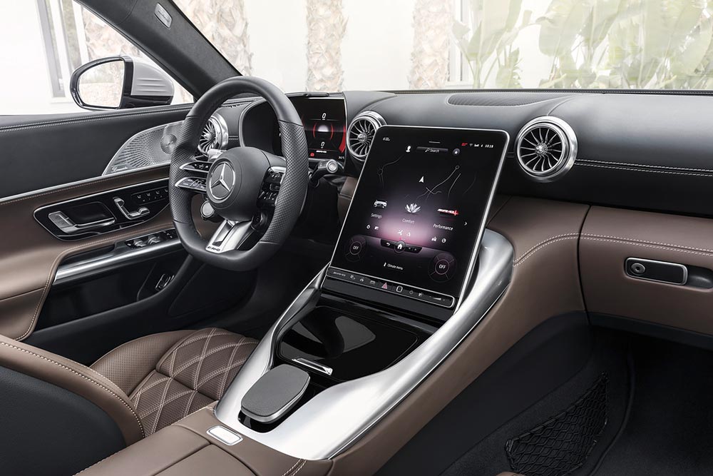 Εντυπωσιακό είναι και το εσωτερικό, όπου πολυτέλεια και υψηλή τεχνολογία συνδυάζονται με αρμονικό τρόπο. Στο ταμπλό κυριαρχεί η οθόνη των 11,9 ιντσών με την έντονη κλίση, όπου συγκεντρώνονται όλες οι λειτουργίες του αυτοκινήτου. Μάλιστα για να αποφευχθούν τυχόν αντανακλάσεις φωτός στην οθόνη όταν η οροφή είναι ανοιχτή, μπορεί να ρυθμιστεί ηλεκτρικά (η οθόνη) με κλίση από 12 έως 32 μοίρες. Η ηλεκτρικά ανοιγόμενη μαλακή οροφή (αντί μεταλλικής στην προγενέστερη SL) εξασφάλισε μείωση βάρους κατά 21 κιλά. Επίσης δόθηκε ιδιαίτερη έμφαση στην ηχομόνωση που παρέχει, κάτι που επιτεύχθηκε μέσω της χρήσης τριών διαφορετικών στρωμάτων από υψηλής ποιότητας υλικά. Η όλη διαδικασία ανοίγματος διαρκεί περίπου 15 δευτερόλεπτα και είναι δυνατή εν κινήσει, έως τα 60 χλμ./ώρα. Ο σκελετός αποτελείται από χάλυβα και αλουμίνιο, ενώ το εξωτερικό κάλυμμα διατίθεται σε μαύρο, γκρι ή κόκκινο. Η οροφή αποθηκεύεται πλήρως στο μικρό χώρο αποσκευών των 240 λτ. (όταν είναι κλειστή).