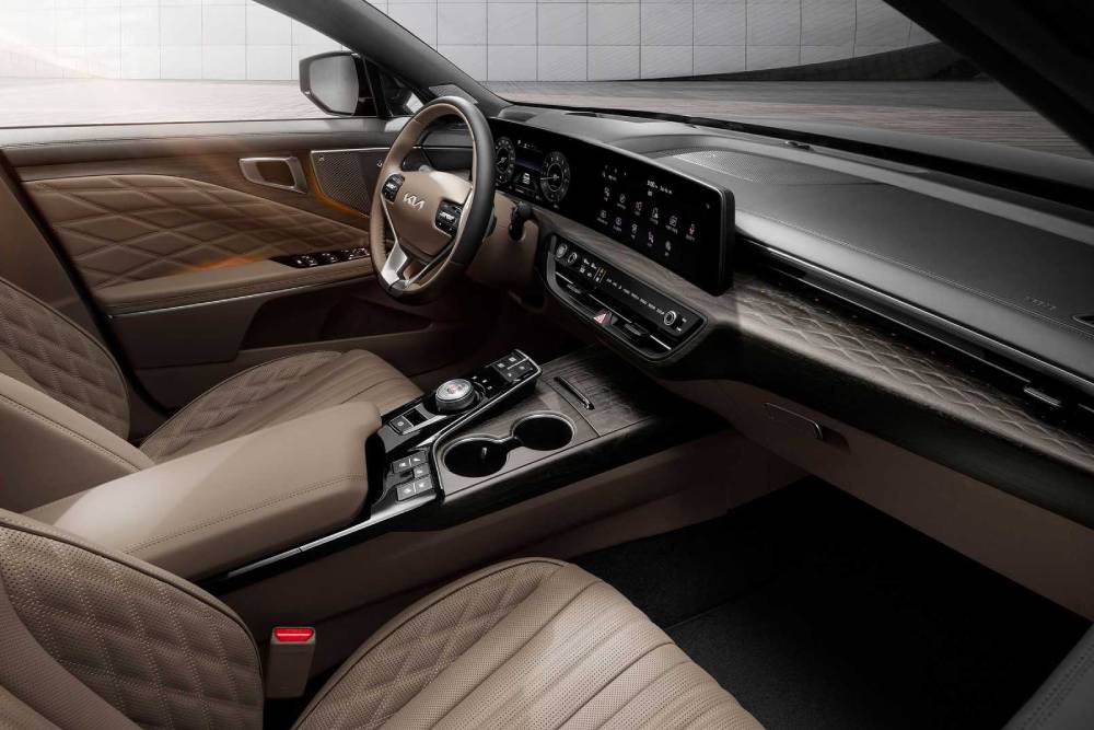 Στο εσωτερικό συναντάμε διπλές οθόνες 12 ιντσών (μία για τον ψηφιακό πίνακα οργάνων, μία για το σύστημα πολυμέσων), που κυριαρχούν στο πάνω μέρος του ταμπλό. Ένα ταμπλό που χαρακτηρίζεται από τα ποιοτικά υλικά και την παρουσία δέρματος σε κάθε σπιθαμή του, ενώ για πρώτη φορά αυτοκίνητο της Kia εφοδιάζεται με το premium ηχοσύστημα Meridian, που αποτελείται από 14 ηχεία. Μοναδικό εξοπλιστικό στοιχείο είναι επίσης η λειτουργία Smart Support στο κάθισμα του οδηγού, που σφίγγει τα πλαϊνά και χαμηλώνει το έδρανο στην οσφυϊκή περιοχή όταν η ταχύτητα ξεπεράσει τα 130 χλμ./ώρα ή έχει επιλεγεί το Sport Mode.