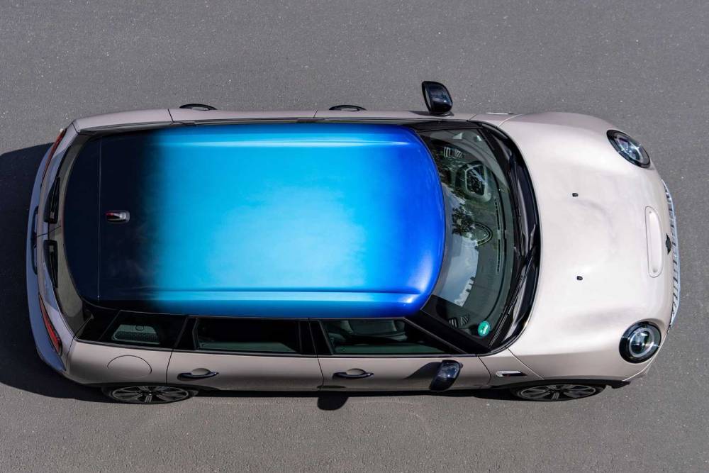 Η Multitone διατίθεται πλέον σε ολόκληρη την γκάμα, ούσα μέχρι πρότινος αποκλειστικό προνόμιο του ηλεκτρικού Cooper SE EV. Όπως βλέπουμε δεν φέρει τα χρώματα της σημαίας του Ηνωμένου Βασιλείου (μεγάλο χιτ σε πολλές οροφές MINI), αλλά ενσωματώνει έναν ιδιαίτερο συνδυασμό που αλλάζει τρία χρώματα από άκρη σε άκρη. Η οροφή ξεκινά με San Marino Blue, ξανοίγει σε Pearly Aqua στο μέσο και καταλήγει στο κατάμαυρο Jet Black για κλείσιμο. Για να βγει πετυχημένα αυτό το περίτεχνο οπτικό αποτέλεσμα, στη βάση τοποθετείται το πιο ανοιχτό χρώμα (Pearly Aqua). Τα άλλα δύο προστίθενται από πάνω και παρότι η διαδικασία είναι αυτοματοποιημένη, η πολυπλοκότητα στη διαστρωμάτωση σημαίνει πως υπάρχουν μικρές διαφορές από εφαρμογή σε εφαρμογή, καθιστώντας έτσι κάθε Multitone οροφή μοναδική.
