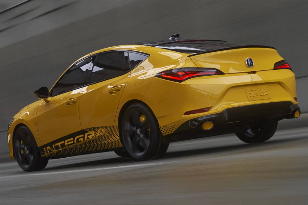 Το Integra Prototype, λοιπόν, ντύθηκε σε ένα φανταχτερό κιτρινόμαυρο συνδυασμό (ακόμα και το εσωτερικό των ψεύτικων απολήξεων είναι βαμμένο), φόρεσε αυτοκόλλητα στις πόρτες, έβαλε τις 19άρες του και μας παρουσιάστηκε, ως ένα γοητευτικό τετράθυρο κουπέ. Η διαμόρφωση του αμαξώματος είχε φανεί από τα teaser των Αμερικανών, με τη γραμμή της οροφής που χαμηλώνει απότομα και συναντά τους ανάγλυφους ώμους, σε συνδυασμό με το αιχμηρό πίσω μέρος και τα δυναμικά σχεδιασμένα φωτιστικά σώματα, να γεμίζουν σπορ αύρα το δυναμικό liftback (γιατί περί αυτού πρόκειται).