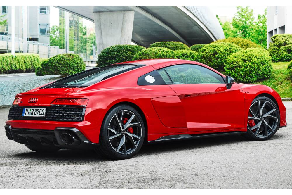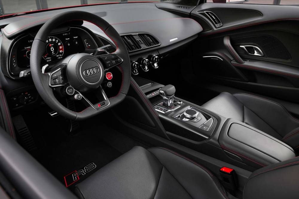 Το πισωκίνητο R8 Performance εμφανίζεται πανομοιότυπο με το απλό εμφανισιακά, έχοντας τις 19άρες ζάντες (προαιρετικά 20 με το πακέτο Edition, που διατίθεται και στο Quattro) και τα ανθρακονημάτινα αεροδυναμικά βοηθήματα να ξεχωρίζουν. Παρόμοια εικόνα στο εσωτερικό, όπου δεσπόζει ο ψηφιακός πίνακας οργάνων Virtual Cockpit των 12,3 ιντσών και τα μπάκετ της Recaro.