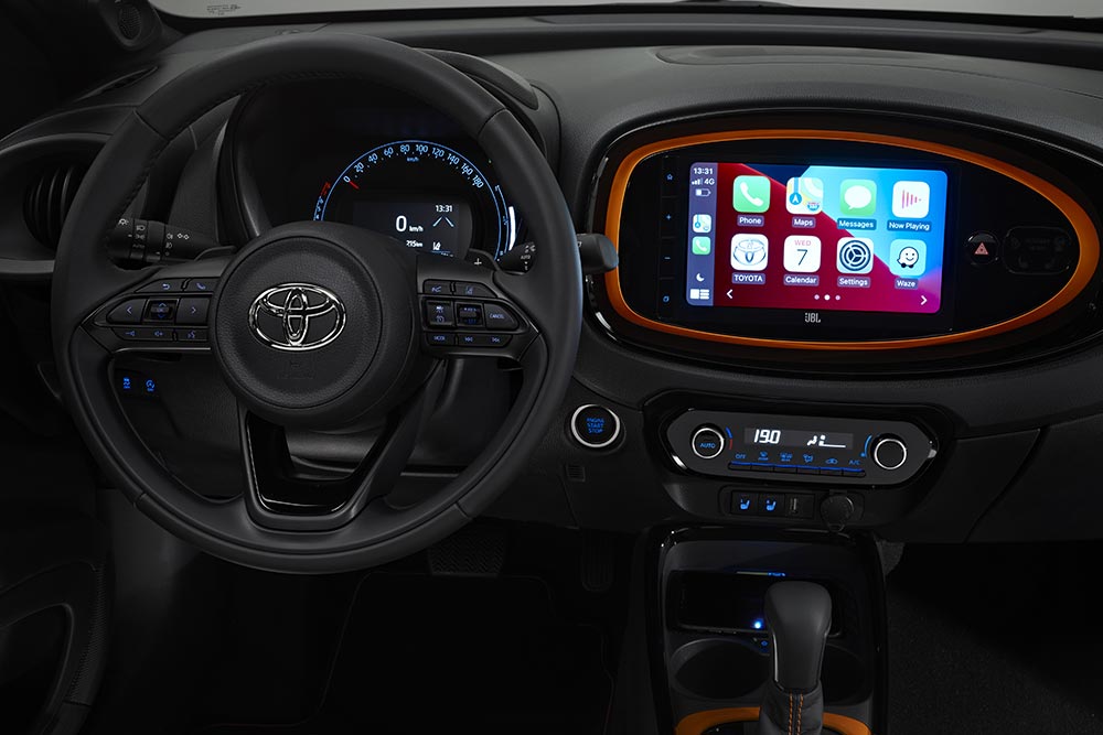 Το εσωτερικό του νέο Aygo X είναι αρκετά ψηφιοποιημένο, με κύριο πρωταγωνιστή την οθόνη του infotainment Toyota Smart Connect με διαγώνιο 9 ιντσών, που μπορεί να δεχτεί ενημερώσεις over the air και είναι συμβατή με τα πρωτόκολλα Apple CarPlay και Android Auto. Καλοδεχούμενη είναι όμως κι η οθόνη που έχει προστεθεί στον αναλογικό πίνακα οργάνων, ολοκληρώνοντας την απαιτούμενη πληροφόρηση που θέλει ο οδηγός του Aygo X. Το νέο μοντέλο της Toyota έχει κάνει μεγάλα βήματα προόδου και σε ότι αφορά την ασφάλεια, μιας και το «παρών» δίνει η σουίτα συστημάτων ασφαλείας Toyota Safety Sense, ενσωματώνοντας το σύστημα αποφυγής σύγκρουσης (Pre-Collision System) με εντοπισμό οχημάτων ακόμα και σε μεγάλες ταχύτητες. Ντεμπούτο κάνει όμως και το σύστημα ανίχνευσης πεζών για μέρα και νύχτα, με δυνατότητα ανίχνευσης ποδηλατών τη μέρα, όπως και οι τεχνολογίες Collision Mitigation Support, ενεργό cruise control, και το σύστημα διατήρησης λωρίδας κυκλοφορίας.